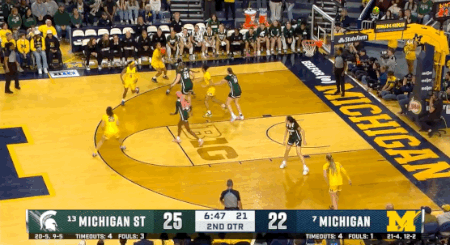 Quarles Daniels, Michigan’s 5’6” pest extraordinaire, rebounded two missed three-pointers on the very next possession before wrapping a pass around two defenders to Kendall Dudley for a layup. On MSU’s next trip down the floor, BQD jumped an inbounds pass for a steal. When her would-be-assist on the ensuing fast break ended up out of bounds off MSU following a missed Holloway layup, she once again hit the glass, setting up a Holloway triple after yet another offensive rebound.