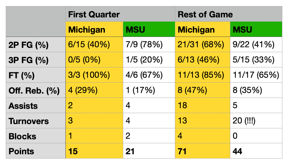 In a rather unfair development, U-M shot the lights out in the second half while continuing to confound the Spartans on defense. The first quarter turned out to be an aberration; the rest of the game was a blowout.