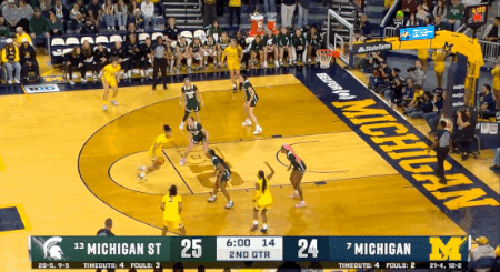 Early on, Michigan State played like the rivalry foe of old, opening up an eight-point first-quarter lead by overwhelming Michigan’s interior defense. The Wolverines started ice cold from the field. Mila Holloway picked up two quick fouls. A repeat of the February 1st overtime thriller at the Breslin Center felt like a best-case scenario.